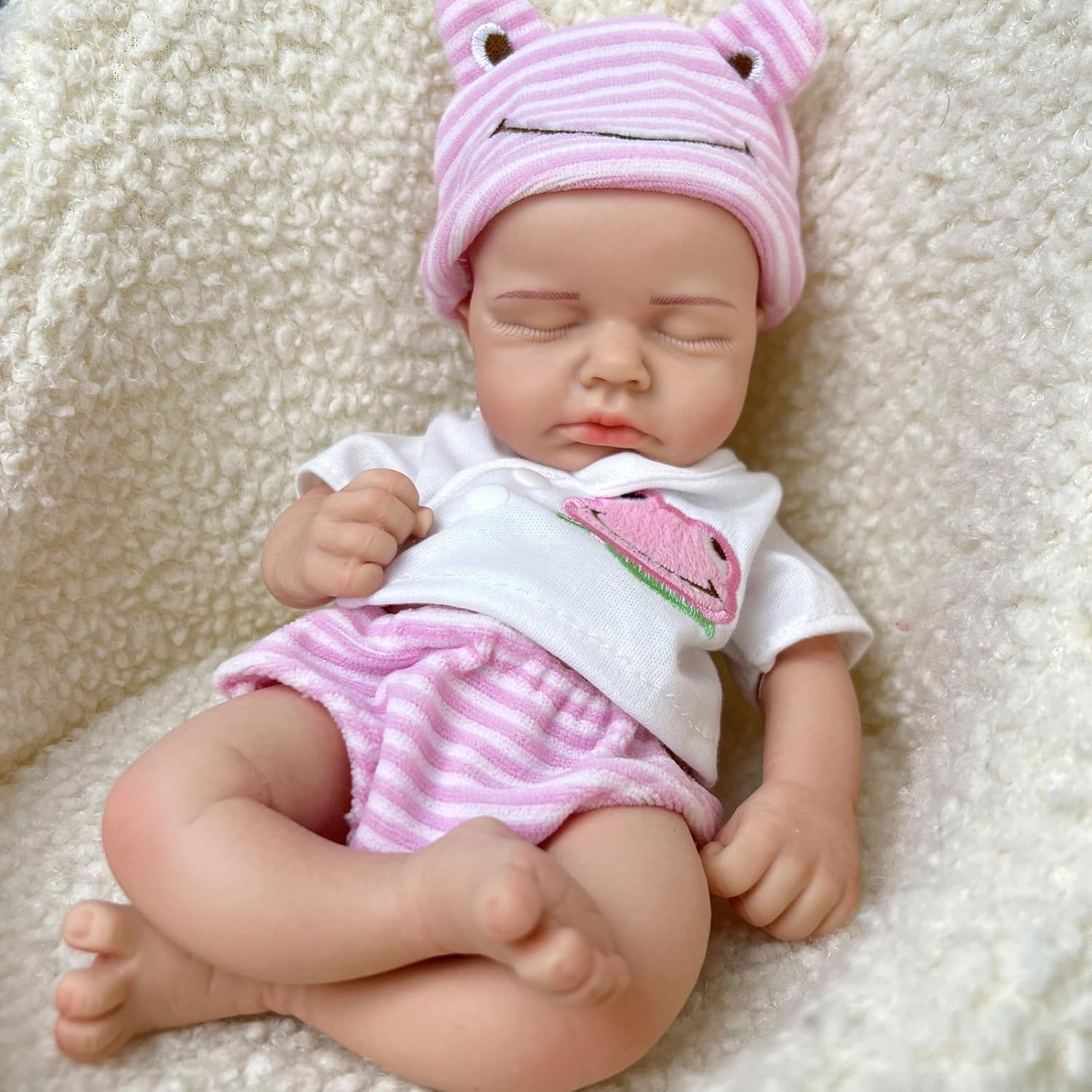 - Ultra-Realistic Newborn Design: Features hand-rooted eyelashes, hand-painted eyebrows, lifelike skin textures with visible veins, and a serene sleeping expression that mimics a real infant’s delicate features.